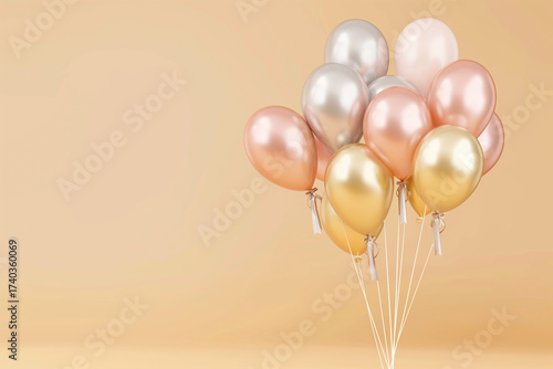 Elegant pastel balloons in gold, silver and rose colors with copy space for festive decoration and celebration background