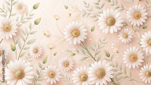 daisy, flower, floral, botanical, pastel, delicate, elegant, soft, cream, white, green, leaf, branch, background, design, pattern, texture, illustration, artwork, art, pretty, beautiful, nature