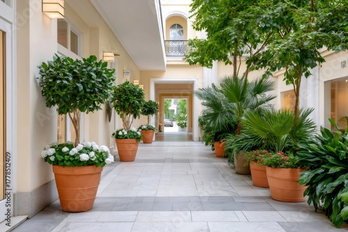 paseo, patio, hallway, courtyard, plant, pot, architecture, elegant, luxury, building, green, design, environment, hotel, resort, garden, interior, exterior, open, bright, sunny, tranquil, peaceful, serene, inviting, comfortable, chic, sophisticated, modern, classic, mediterranean, tropical, urban, apartment, home, living, lifestyle, relaxation, leisure, travel, destination, nobody, daytime, horizontal, natural light, shadow, entrance, passage