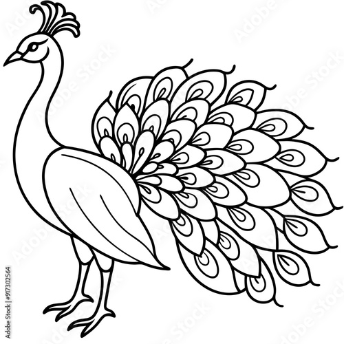 peacock, bird, feather, wildlife, animal, nature, line art, black-and-white, drawing, vignetting, outline, detailed, graceful, beautiful, majestic, avian, symbolic, artistic, design, ornate, plumage, fowl, zoology, regal, decorative, vector, illustration, graphic, isolated, white background, curved, curly, exotic, tropical, print, poster