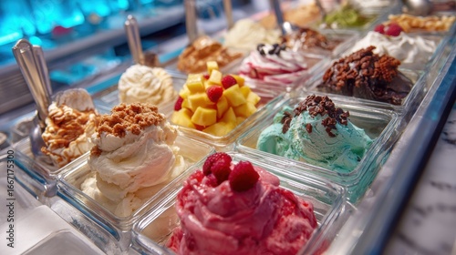 Elegant photo of stunning presentation of assorted gelato flavors and toppings, displayed in an eye-catching way, appealing to those with a sweet tooth against a lively.