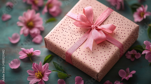 Elegant pink gift box with ribbon and rose decor surrounded by petals on a teal background. Great for birthdays, weddings or Valentine's.