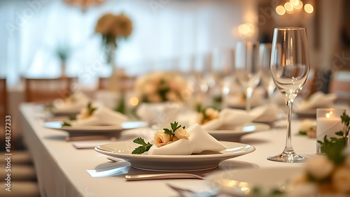 Elegant plated dishes on a banquet table, featuring warm ambient lighting and shallow depth of field.