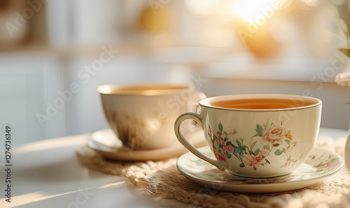 Elegant porcelain tea cups with delicate floral patterns on saucers. Warm morning sunlight. Soft shadows on wooden table. Cozy and nostalgic atmosphere. Peaceful tea moment.