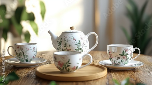 Elegant Porcelain Tea Set Featuring Matching Cups and Saucers, Perfect for Afternoon Tea Gatherings with Delicate Floral Design and Classic Teapot