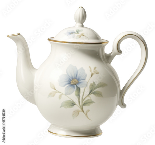 Elegant porcelain teapot with floral design and gold accents on transparent background.
