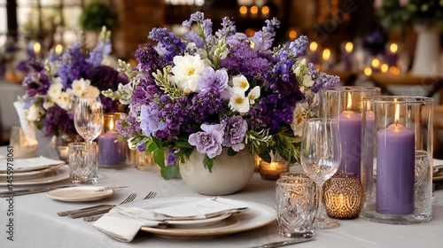 floral, centrepiece, table, purple, flower, arrangement, candle, dinner, wedding, decoration, elegant, rustic, setting, design, decor, event, party, celebration, bouquet, lilac, spring, summer, cream, light, candlelight, dining, napkin, plate, glassware, pottery, vase, modern, luxury, tableware, beautiful, pretty, sophisticated, chic, home