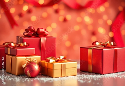 Elegant red & gold Christmas gift boxes with ribbon, festive, sparkle