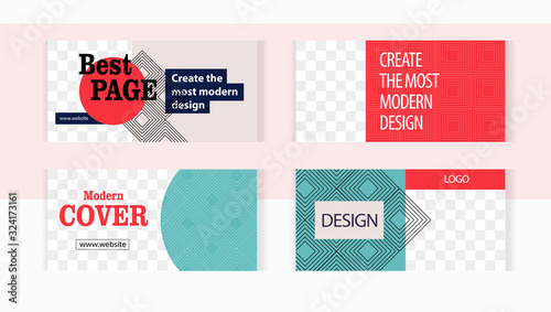 Elegant red and pastel colors linear patterns. Background set horizontal banner templates with frame for images. Stylish design for creativity.