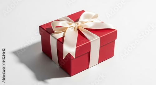 Elegant Red Gift Box with Cream Ribbon on White Background, Studio Lighting