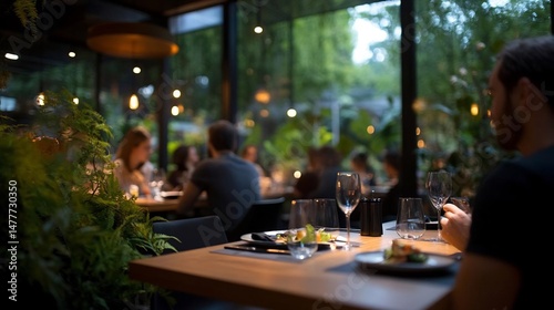 Elegant restaurant ambiance with lush greenery and patrons enjoying their meals