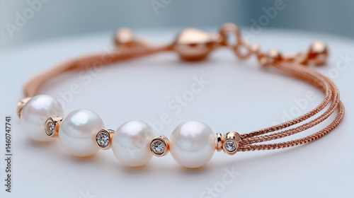 Elegant rose gold bracelet featuring pearls and diamonds, displayed on a soft white background.