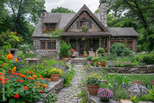 Elegant rustic cottage front yard with stone path, lush greenery, detailed shingle roof, and white-framed windows in a serene garden setting.