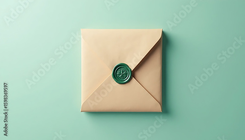 Elegant Sealed Envelope with Wax Seal on Minimal Background | Sophisticated beige envelope with green wax seal, neatly placed on a soft teal background, symbolizing elegance, tradition & communication