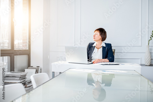 Elegant senior businesswoman dressed in the suit working with laptop and documents at the white office. Wide angle view with copy space