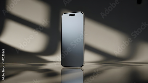 Elegant smartphone standing on a glossy surface with dramatic lighting.