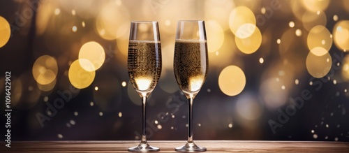 Elegant sparkling wine glasses on a wooden surface with blurred golden bokeh background and ample copy space for festive celebrations