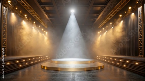 stage, lighting, performance, smoke, theatre, spotlight, show, event, entertainment, ambience, dramatic, scene, modern, design, round, illumination, art, creativity, production, venue, exhibition, showcase, culture, artistic, concept, talent, visual, music, glow, indoor, empty, presentation, digital, architecture, futuristic, style, area, space, platform, decor, fog, theatrical