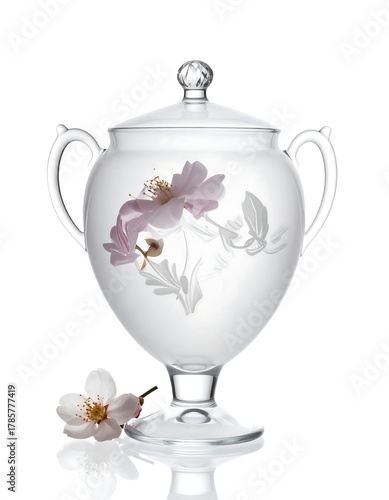 Elegant stemmed glass jar with lid, decorated with delicate floral artwork, featuring handles and a small blossom beside
