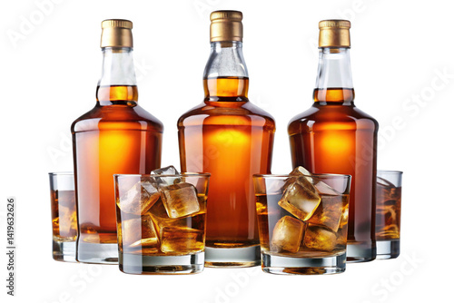 whiskey, scotch, bourbon, alcohol, drink, beverage, ice, cube, glasses, bottle, liqueur, amber, brown, gold, liquid, cold, refreshment, party, celebration, bar, pub, eatery, still life, luxury, expensive, premium, quality, vintage, classic, isolated, white background