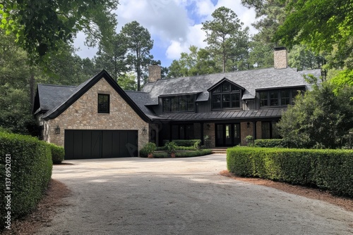 stone, house, suburban, home, lush, tree, gravel, driveway, sunny, day, residential, area, serene, surrounding, elegant, architecture, nature, peaceful, environment, suppressing, attracted, large, window, space, landscaping, contemporary, design, family, residence, green, foliage, entrance, front, porch, charming, facades, light, cloud, summer, neighbourhood, modern, custom, luxury, living, privacy, tranquil, atmosphere, inviting