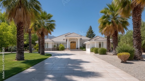 Elegant suburban home with palm trees and landscaped yard under clear blue sky, showcasing modern architecture and inviting entrance pathway