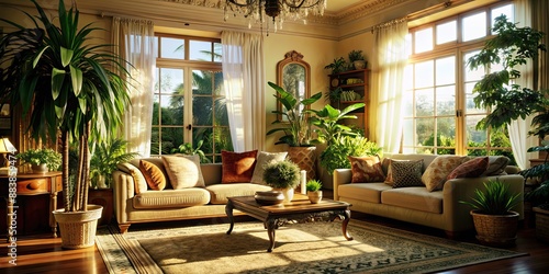 Elegant sunlit living room with indoor plants and cozy sofa , elegant, sunlit, living room, indoor plants, cozy