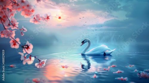 cygnet, lake, water, sunset, sky, cherry, blossom, flower, pink, blue, calm, serene, elegant, dreamy, nature, wildlife, peace, calmness, graceful, light, gold, cloud, soft, gentle, beauty, art, digital, painting, fantasy, whimsical, romantic, peaceful, harmony, stillness, colours, high-coloured