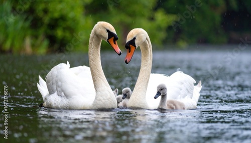 Elegant swans embrace in a heart shape while protecting their cygnets in a serene pond scene