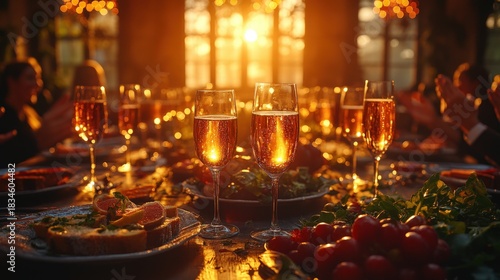 Elegant table setting featuring champagne glasses and gourmet food plates, illuminated by warm lighting. Perfect for events, parties, or luxury product displays.