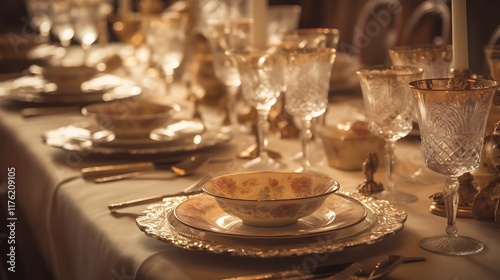 table, setting, elegant, gold, accent, floral, dish, plate, bowl, goggles, silverware, cutlery, crystal, glassware, candle, candle, centrepiece, dinner, dining, room, interior, home, decor, design, luxury, sophisticated, rich, warm, light, ambience, romantic, charming, beautiful, aesthetic, ornate, pattern, flower, rose, vintage, antique, classic, style