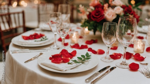 Elegant table setting with red rose petals, wine glasses, and floral centerpiece, creating a romantic ambiance for a special occasion or celebration.