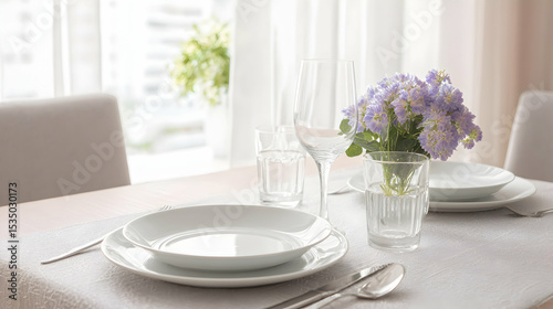 table, setting, dinner, place, flower, white, plate, glasses, dining, silverware, clean, arrangement, interior, linen, tableware, decoration, formal, empty, eatery, home, decor, elegant, celebration, event, meal, design, catering, luxury, minimal, nobody, bright, indoor, napkin, spoon, fork, knife, setup, light, modern, fresh, simple