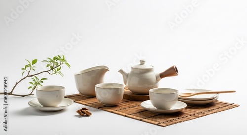 teapot, teacup, ceramic, tea, beverage, cup, still life, porcelain, asian, tableware, refreshment, oriental, wellness, zen, japanese, chinese, culture, traditional, service, arrangement, lifestyle, tree branch, leaf, nature, mat, bamboo, white, brown, light, serene, simplicity, clean, peaceful, calm, quiet, aesthetic, elegance, minimal, crockery, object