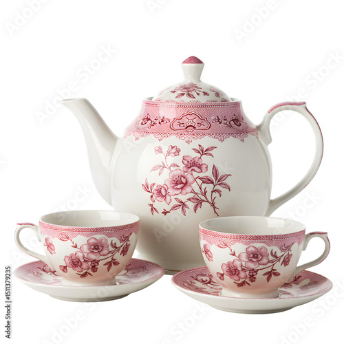 Elegant Tea Set: Porcelain Teapot and Cups with Rose Design on transparent background