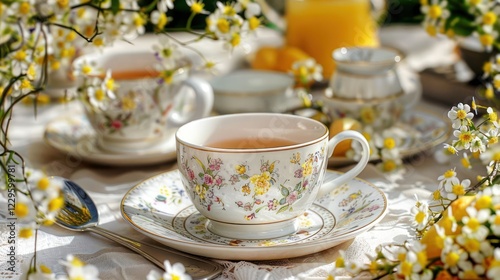 tea, flower, cup, saucer, setting, elegant, bloom, citrous, drink, spring, nature, beverage, table, decoration, afternoon, sunlight, refreshment, floral, style, leisure, relaxation, celebration, garden, culture, lifestyle, harmony, warmth, joy, beauty, gathering, brunch, picnic, colours, cheerful, design, porcelain, vintage, hospitality, sweetness, aroma, fresh, inviting, tranquil, moment, taste, life events, simplicity, charme, delight
