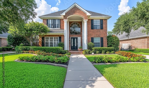 Elegant two-story brick house with a well-maintained garden and manicured lawn, featuring a paved walkway leading to the front entrance with white columns and black shutters.
