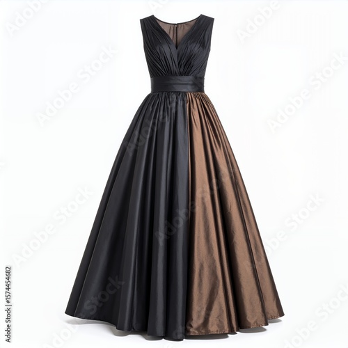 Elegant v-neck gown, classic silhouette in dark and light contrasting tones on white background