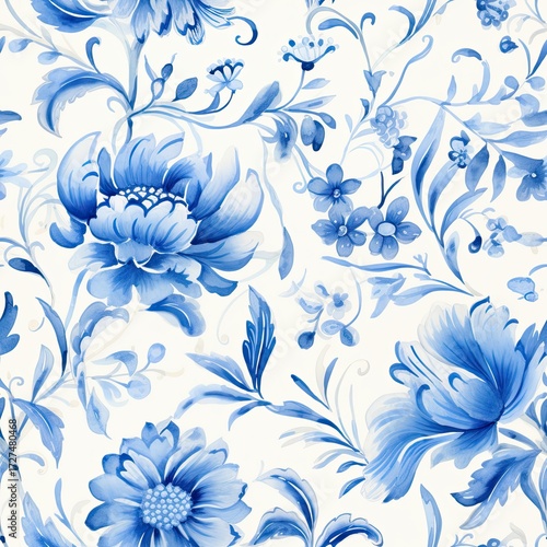 Elegant watercolor floral seamless pattern in blue and white with a classic chinoiserie style for design and decoration.
