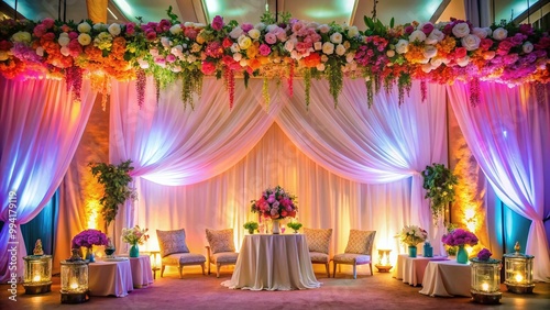 Elegant Wedding Draping with Soft Fabric, Floral Accents and Ambient Lighting for Celebratory Events