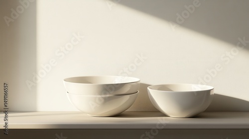 Elegant White Bowls on a Minimalist Shelf in Natural Light
