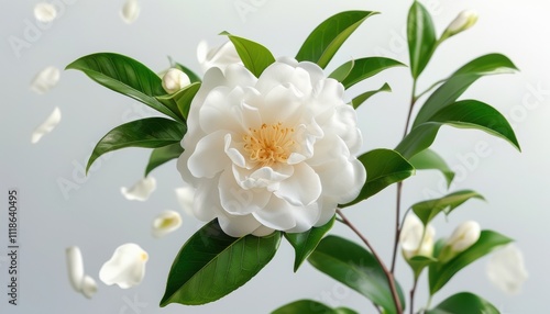 Elegant white camellia bloom with soft petals against a gentle background with copy space