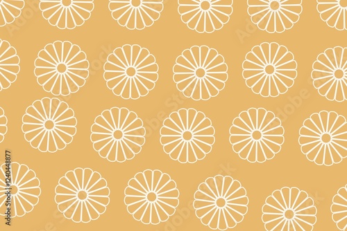 Elegant white chrysanthemum flower pattern on bright yellow background. Japanese cultural motif concept