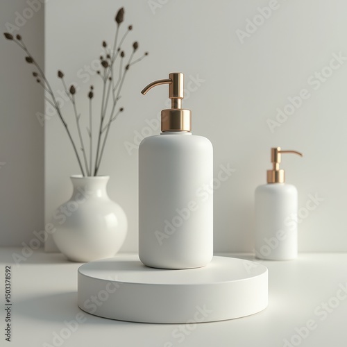 Elegant white cosmetic bottles with gold pump nozzles, set on a minimalist display, perfect for beauty, skincare, or product advertisement.