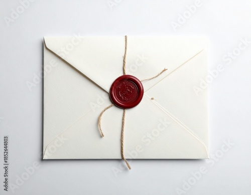 envelope, mail, letter, seal, wax, red, string, white, paper, communication, message, delivery, post, correspondence, package, secret, confidential, invitation, greeting, announce, formal, elegant, classic, vintage, antique, old, texture, detail, closeup, isolated, background, surface, plain, simple, clean, minimal, studio, photo, composition, sharpened, light, shadow, shape, design, craft, art, object, stationery, office