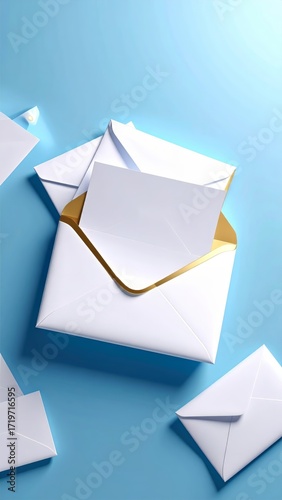 Elegant White Envelopes with Golden Interior on a Serene Blue Surface