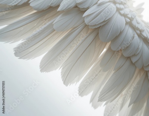 Elegant white feather wings, symbolizing freedom, purity, and hope in a bright, airy setting