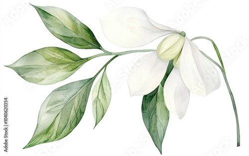 Elegant white magnolia flower with green leaves in a botanical illustration style, capturing the beauty of nature