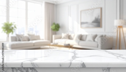Elegant white marble countertop on a blurred background of a modern, bright living room interior, perfect for product display or showcasing items with a sophisticated aesthetic