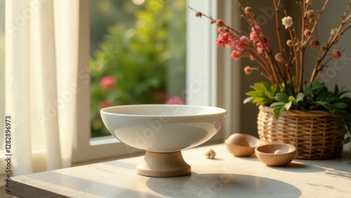 Elegant white pedestal bowl on a sunlit table with a wicker basket of flowering branches